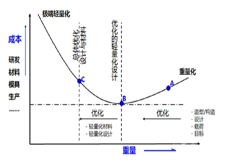 此外,輕量化帶來(lái)的高(gāo)昂成本,如鋁、鎂合金、碳纖維等是一些(xiē)車(chē)企不能商業化應用的根本問題所在。如圖1,從A點到B點是我們最希望做(zuò)到的,既減重又降成本;從B點到C點則需要權衡為(wèi)了提高(gāo)輕量化收益可(kě)以接受多(duō)大(dà)的成本增加;從C向左則帶來(lái)成本巨額增加,不可(kě)采用。